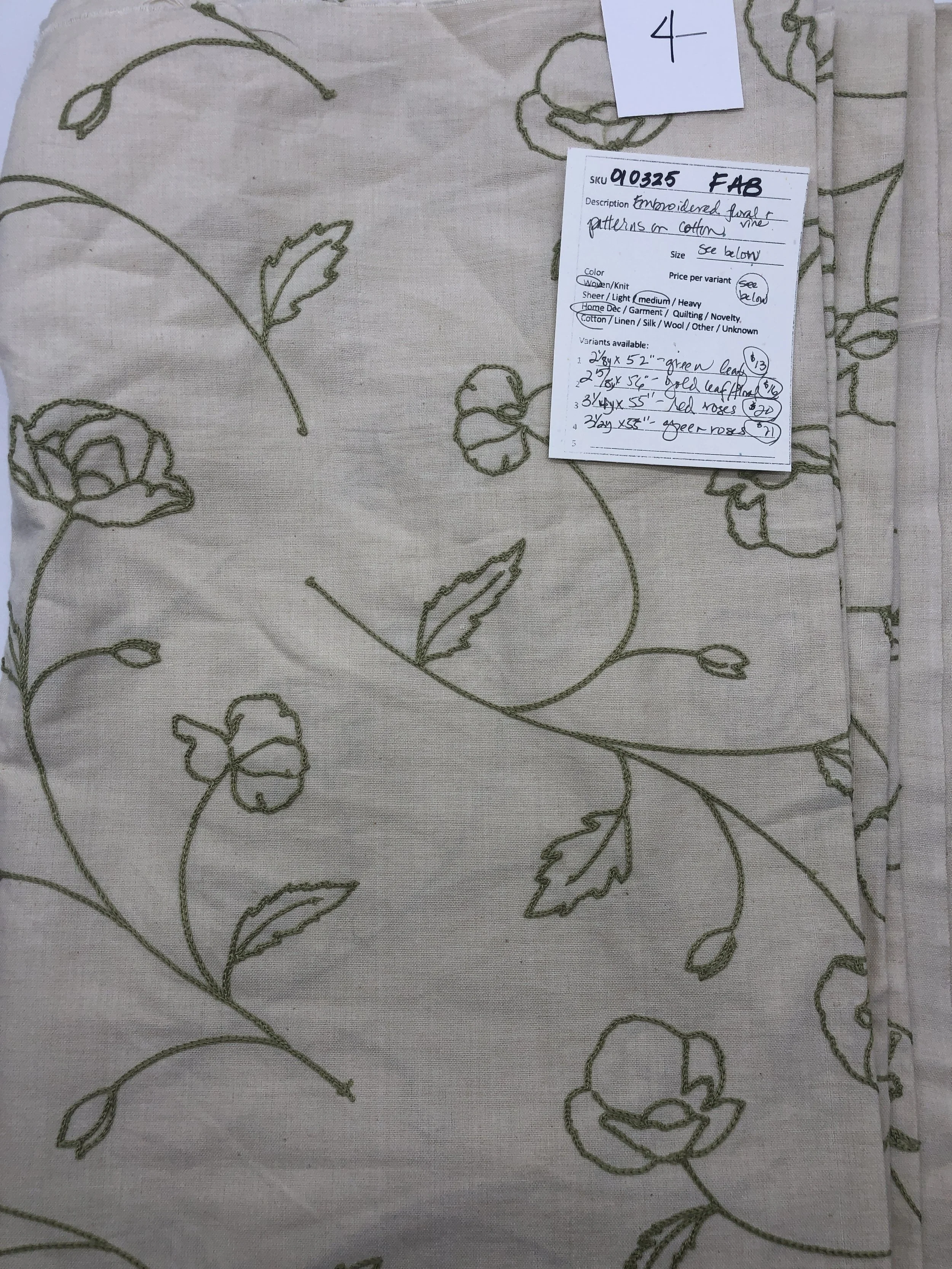 Cotton with embroidered floral and vine pattern on off-white. See variants.