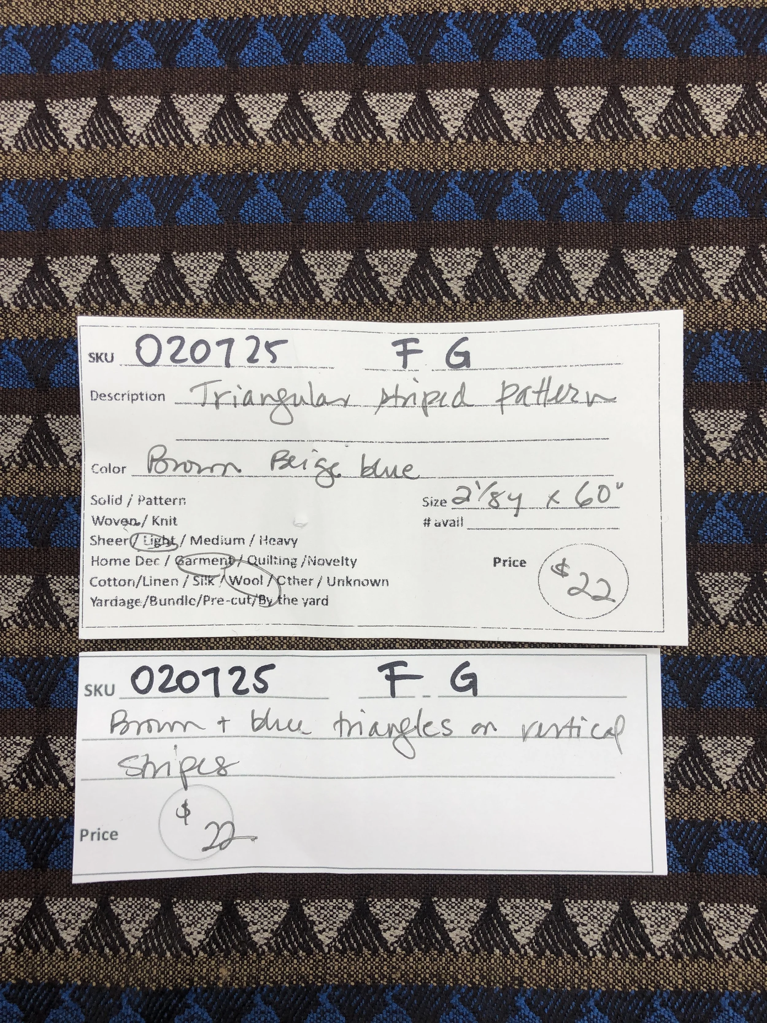 Online Store › 020725-F-G Triangular striped pattern; Wool; 2 1/8 yds x 60" Image 1 of 2 Image 2 of 2 020725-F-G Triangular striped pattern; Wool; 2 1/8 yds x 60" $22.00 Light weight wool with brown and blue triangles on vertical stripes. Add To Cart Added! Light weight wool with brown and blue triangles on vertical stripes.