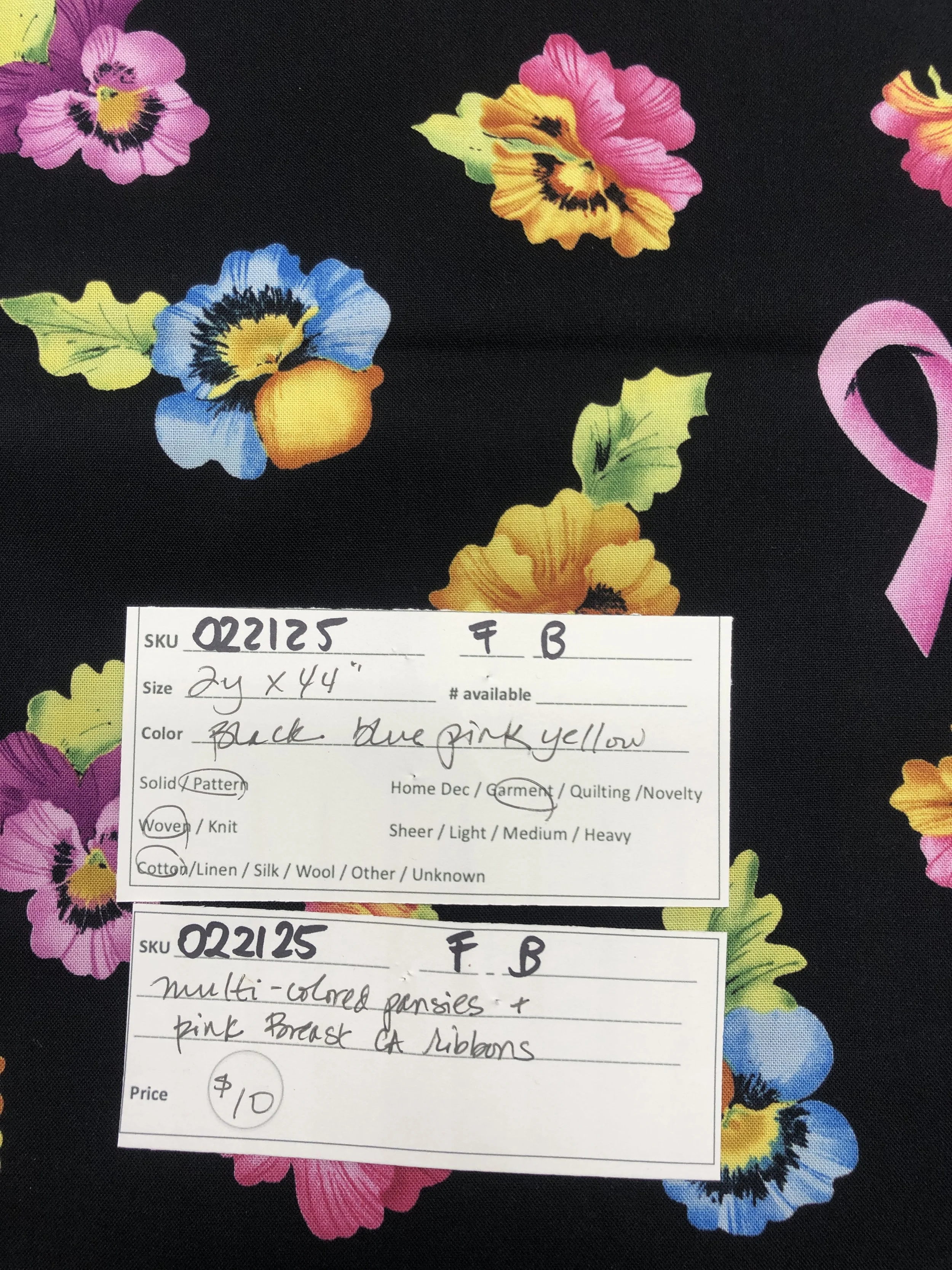 Colorful pansies in pink/blue/yellow & pink ribbons on black. Breast Cancer Awareness fabric. Cotton fabric suitable for garments. Measures 2 yd x 44" wide.