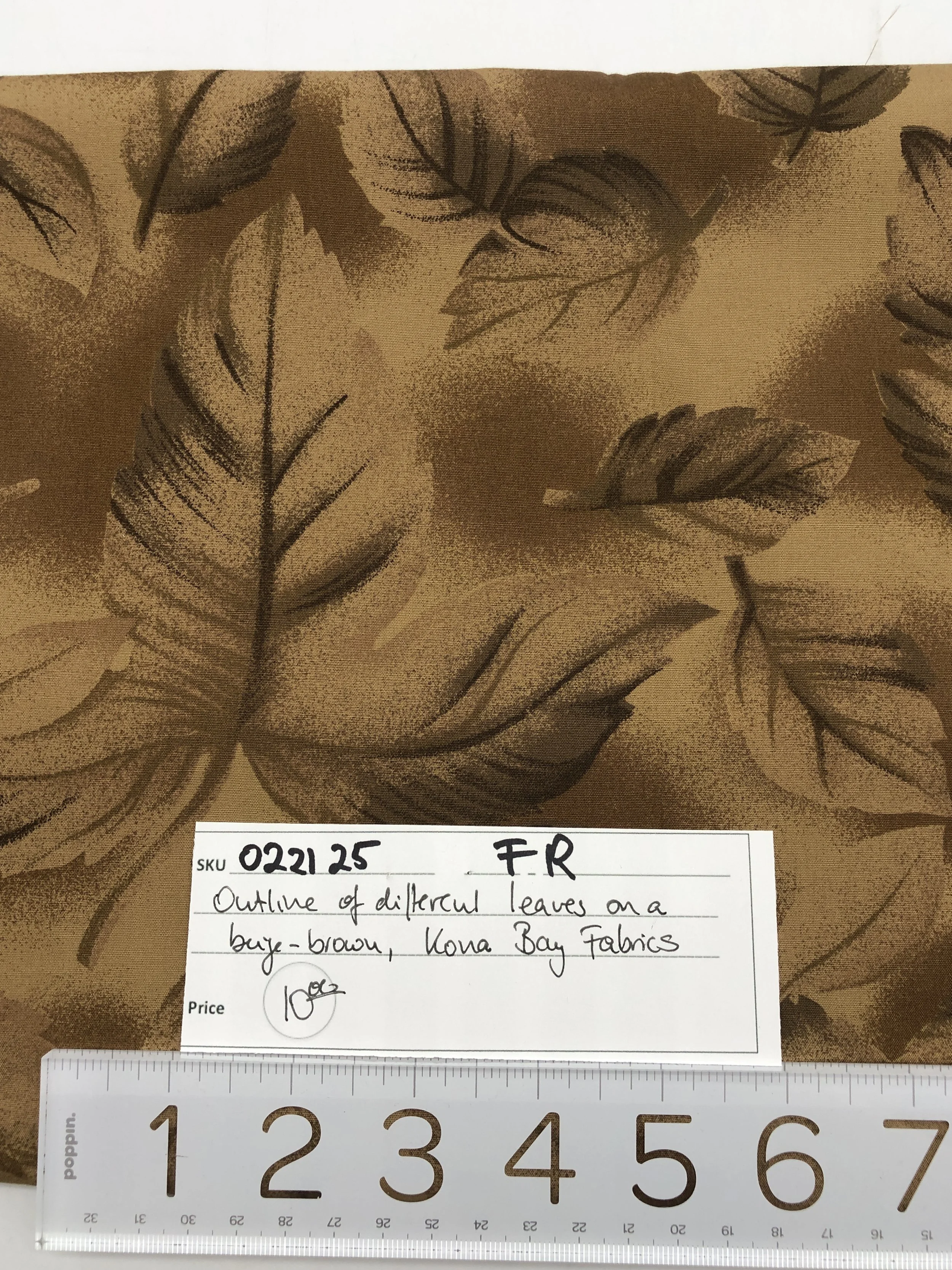 Leaves on beige-brown (Kona Bay Fabrics). Quilting cotton. Measures 2 yd x 44" wide. Note: Fabric is more beige colored and less reddish than it appears in the photos.