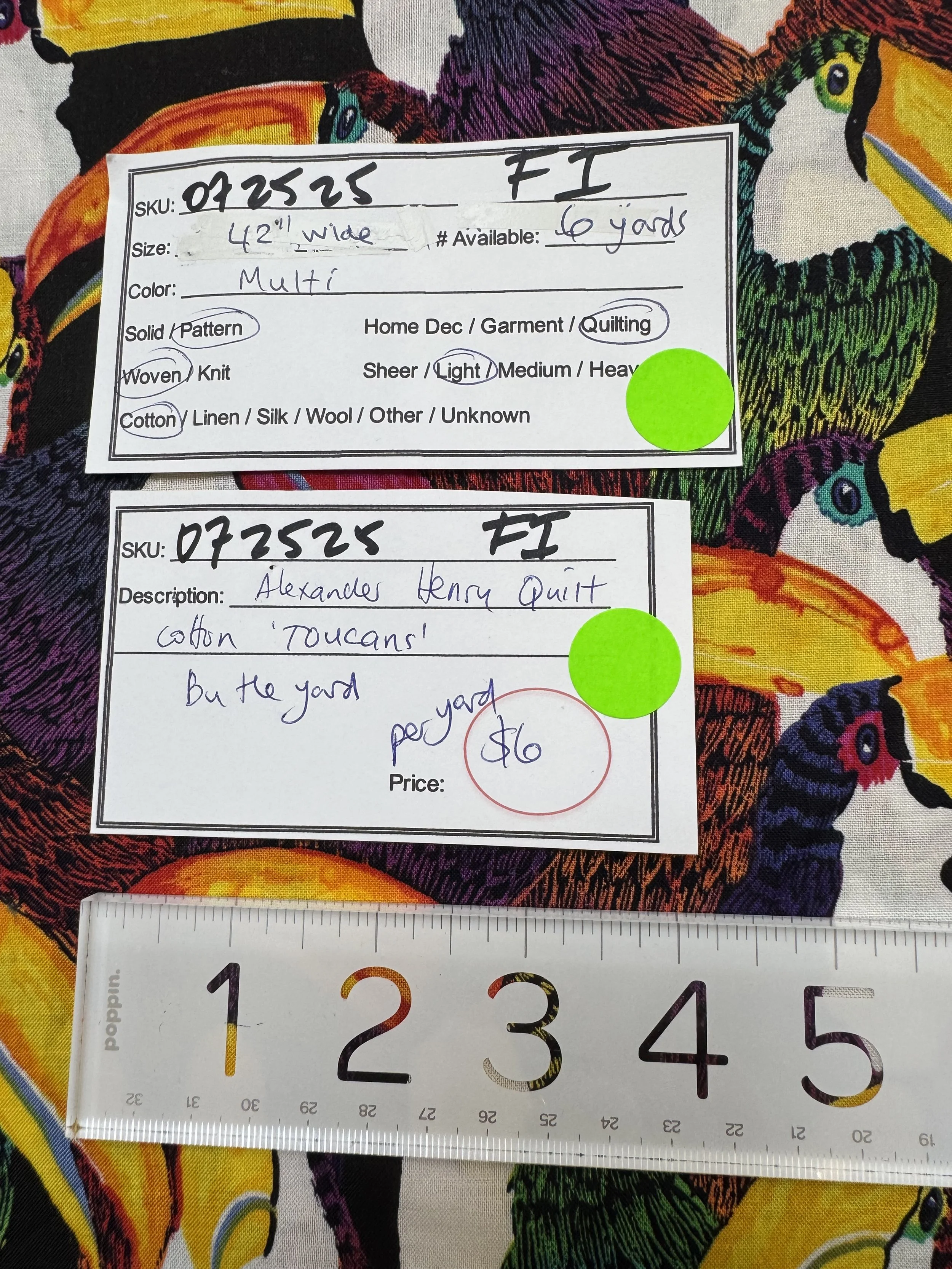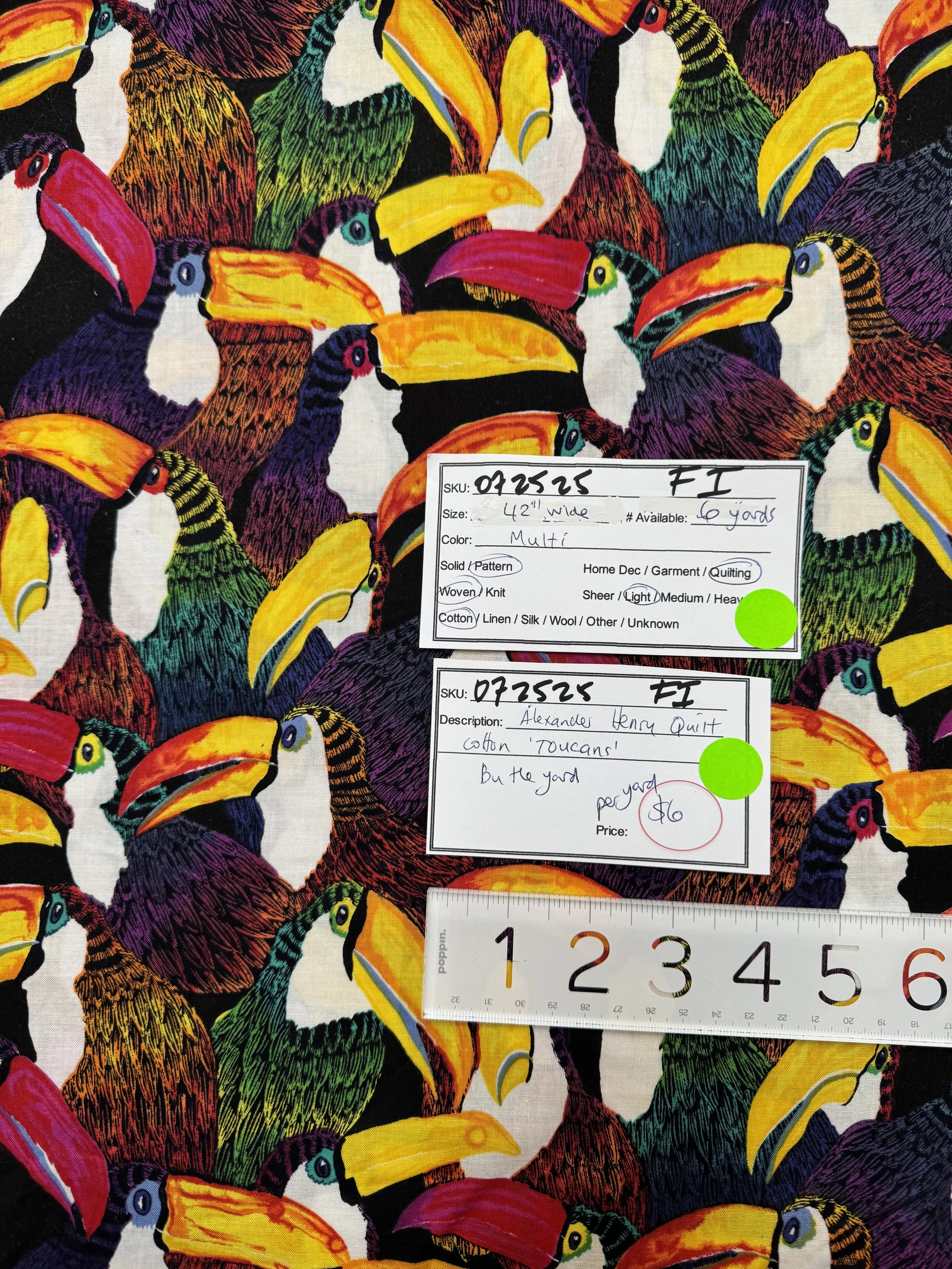 Online Store › 072525-F-I Toucans; Cotton; 42" wide; By the yard Image 1 of 2 Image 2 of 2 072525-F-I Toucans; Cotton; 42" wide; By the yard $6.00 Cotton quilting designed with colorful toucans; by Alexander Henry. Sold by the yard. Six yards available. Quantity: Add To Cart Added! Cotton quilting designed with colorful toucans; by Alexander Henry. Sold by the yard. Six yards available.