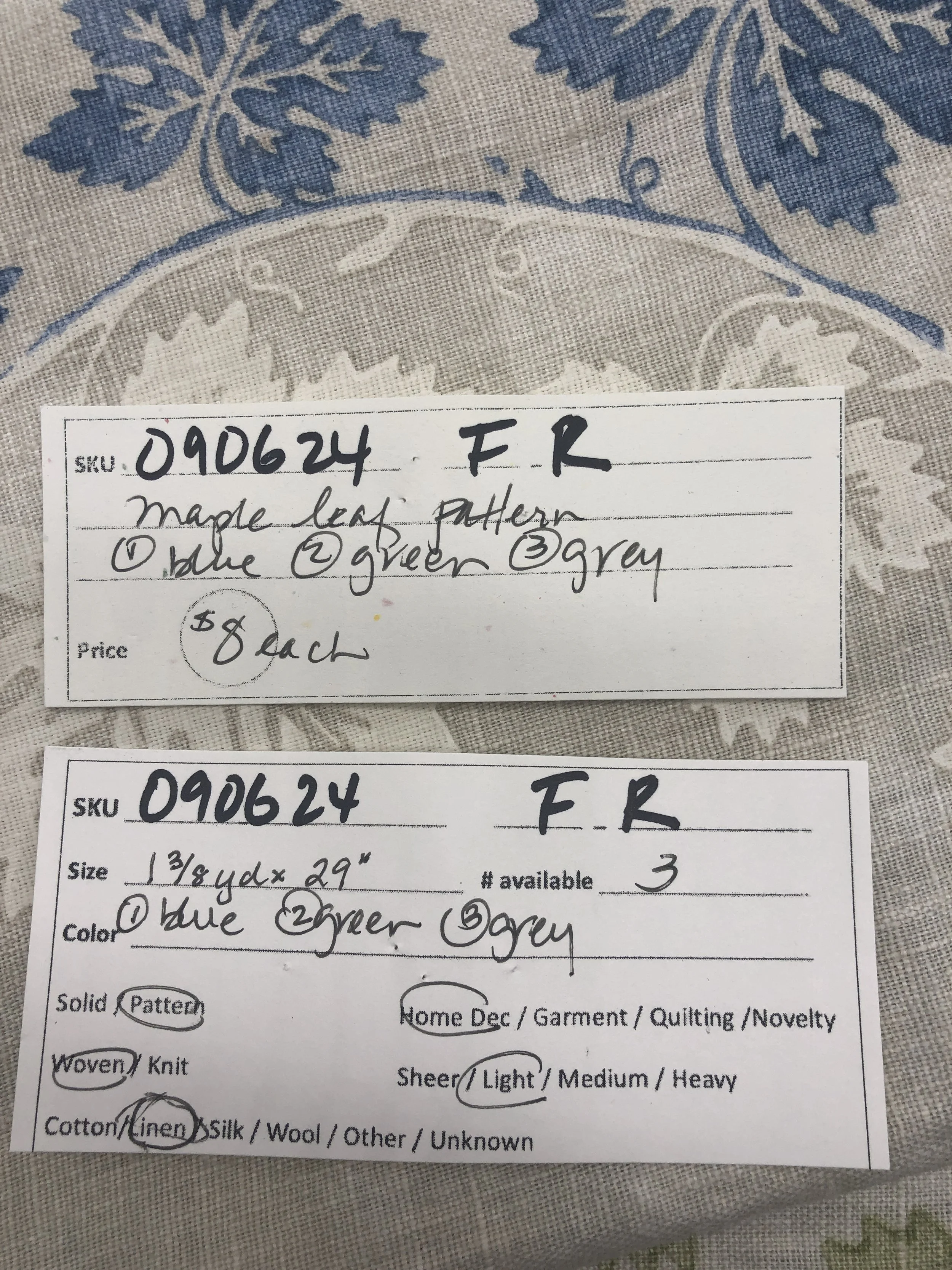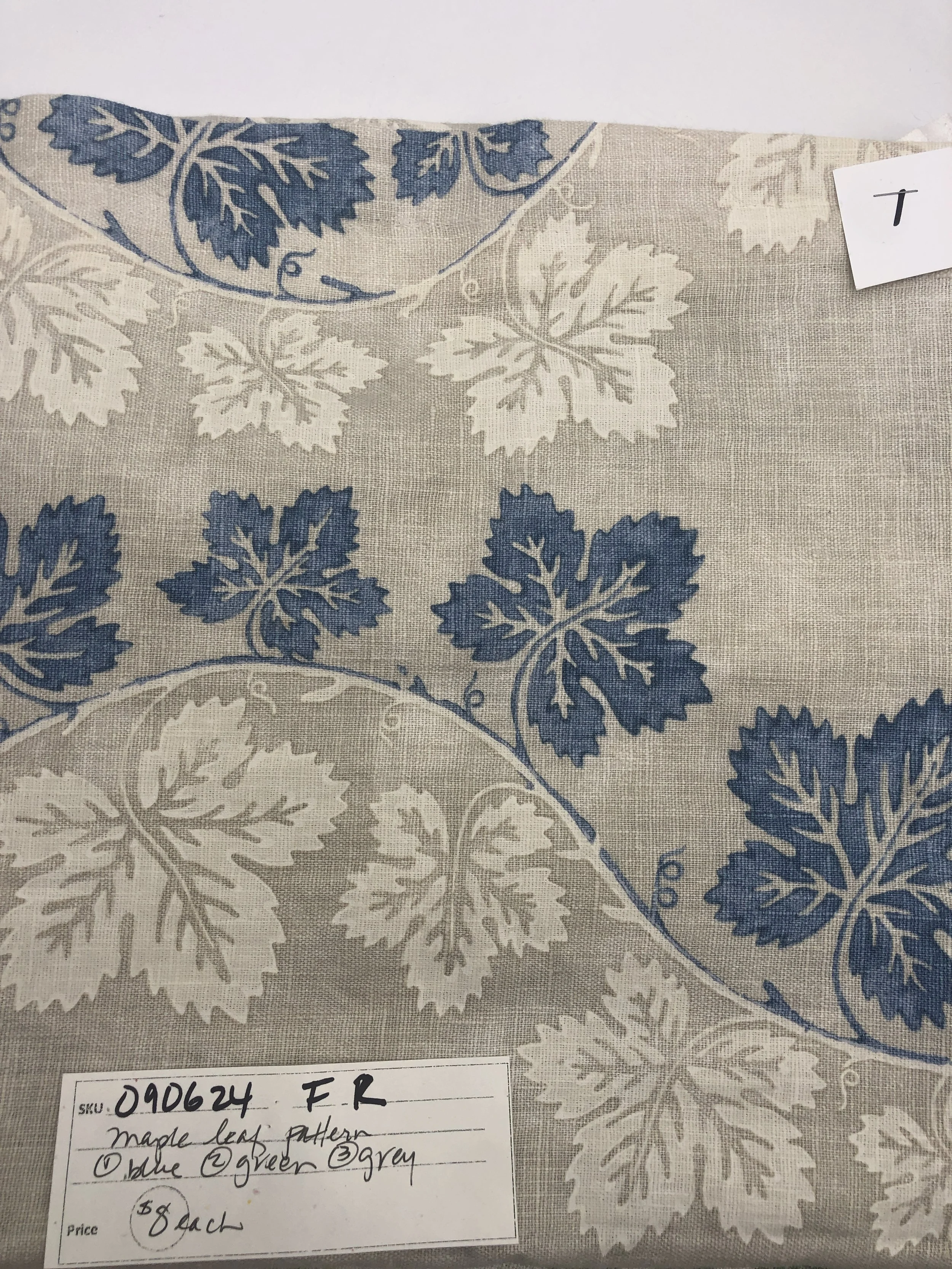 Online Store › 090624-F-R Linen with maple leaves; 1 3/8 yds x 29" Image 1 of 4 Image 2 of 4 Image 3 of 4 Image 4 of 4 090624-F-R Linen with maple leaves; 1 3/8 yds x 29" Sale Price: $4.00 Original Price: $8.00 Maple leaf patterned linen. 3 available. See variants. Sale Color: Blue Green Grey Add To Cart Added! Maple leaf patterned linen. 3 available. See variants. Sale