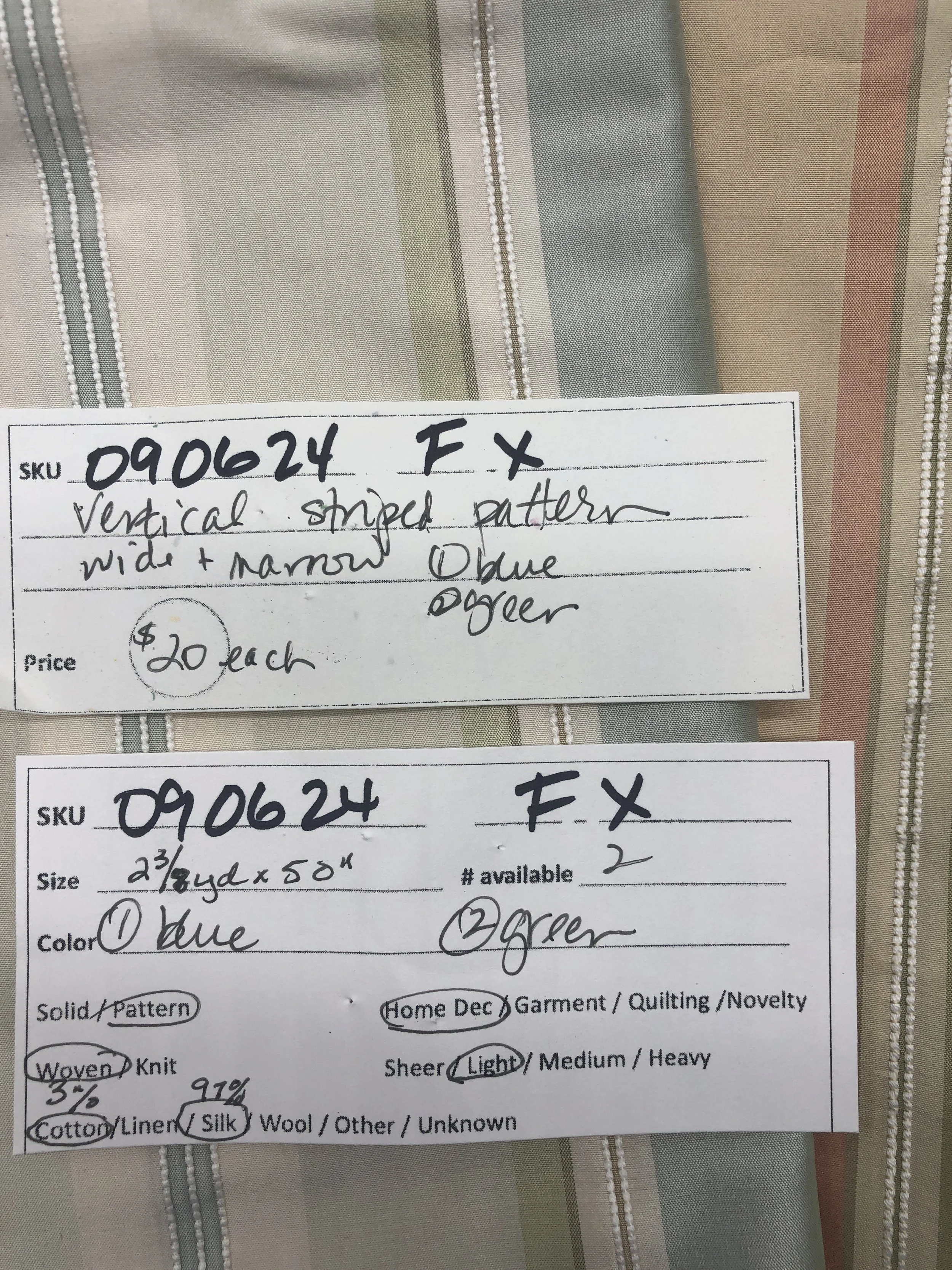 Online Store › 090624-F-X Silk/Cotton with stripes; 2 3/8 yds x 50"; see variants Image 1 of 3 Image 2 of 3 Image 3 of 3 090624-F-X Silk/Cotton with stripes; 2 3/8 yds x 50"; see variants Sale Price: $10.00 Original Price: $20.00 Lightweight silk (97%) and cotton (3%) blend patterned with wide and narrow vertical stripes. Sale Add To Cart Added! Lightweight silk (97%) and cotton (3%) blend patterned with wide and narrow vertical stripes. Sale