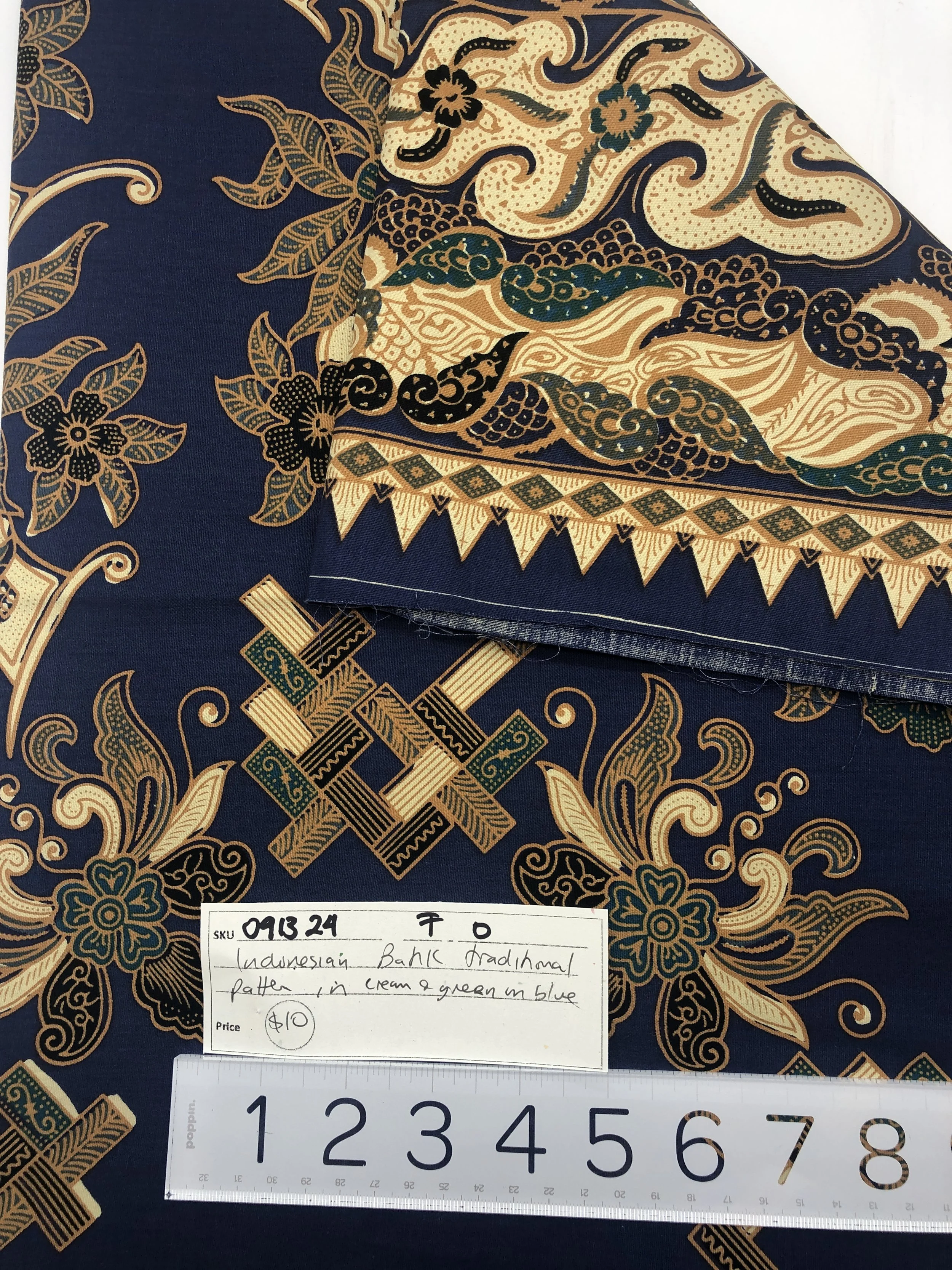 Online Store › 091324-F-O Batik; blue, green & cream; cotton; 1-3/4 yd x 42" Image 1 of 2 Image 2 of 2 091324-F-O Batik; blue, green & cream; cotton; 1-3/4 yd x 42" Sale Price: $5.00 Original Price: $10.00 Indonesian batik with traditional pattern, green and cream on blue cotton, 1-3/4 yards x 42" wide sale Add To Cart Added! Indonesian batik with traditional pattern, green and cream on blue cotton, 1-3/4 yards x 42" wide sale
