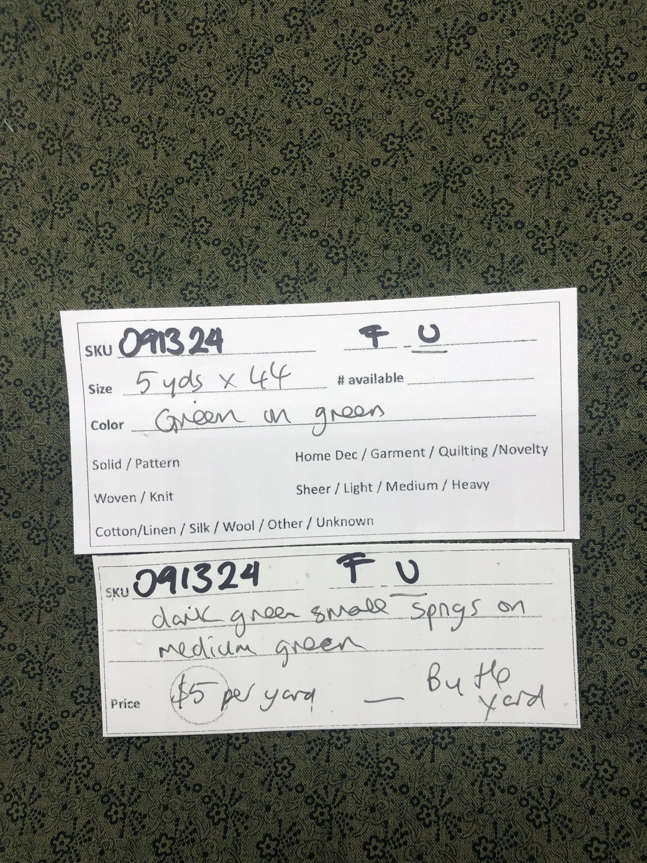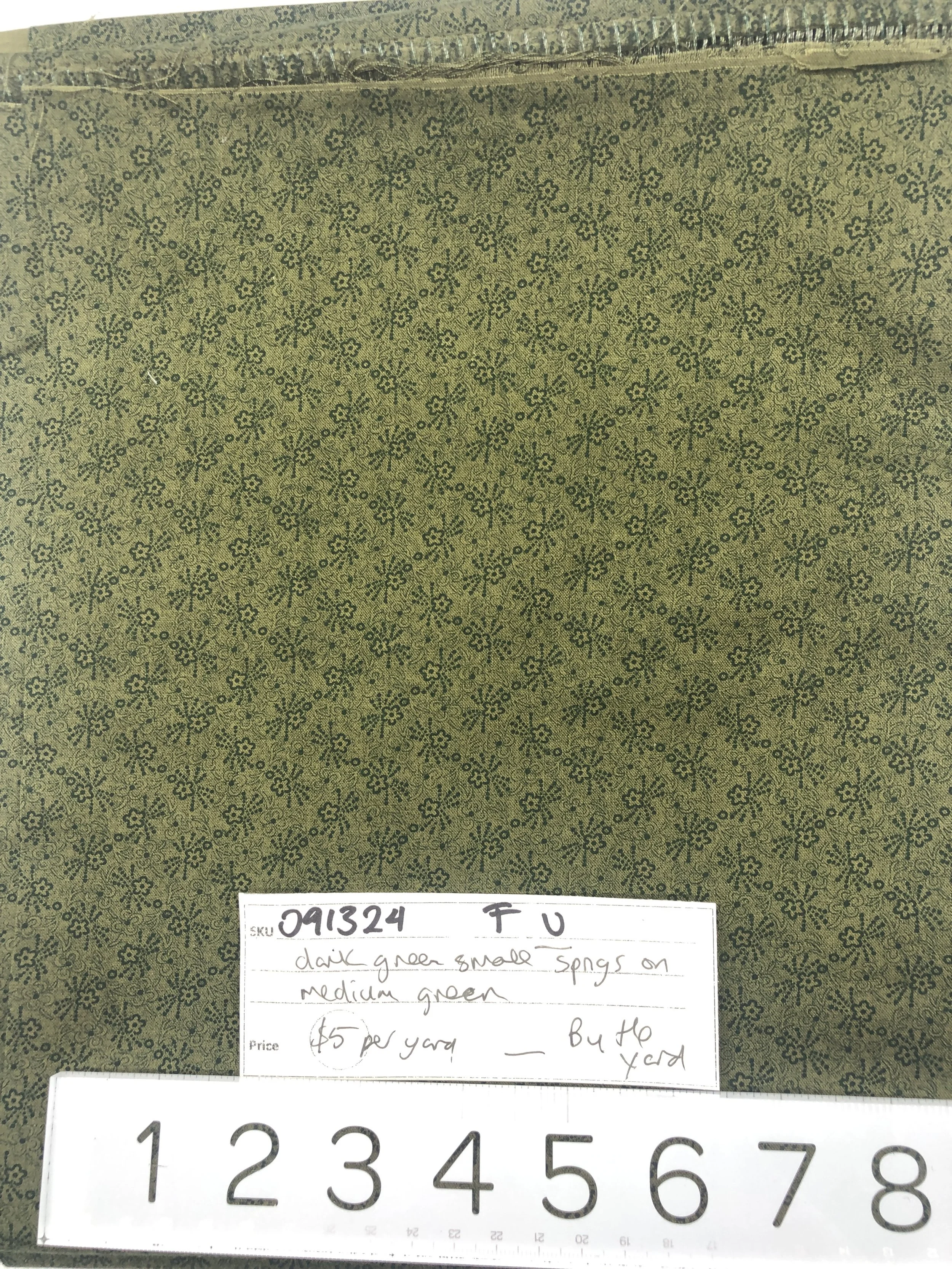 Online Store › 091324-F-U Floral, dark green on green cotton, 44", by the yard Image 1 of 2 Image 2 of 2 091324-F-U Floral, dark green on green cotton, 44", by the yard Sale Price: $3.00 Original Price: $5.00 Dark green small sprigs of flowers on medium green cotton, sold in 1-yard increments, Sale Quantity: Add To Cart Added! Dark green small sprigs of flowers on medium green cotton, sold in 1-yard increments, Sale