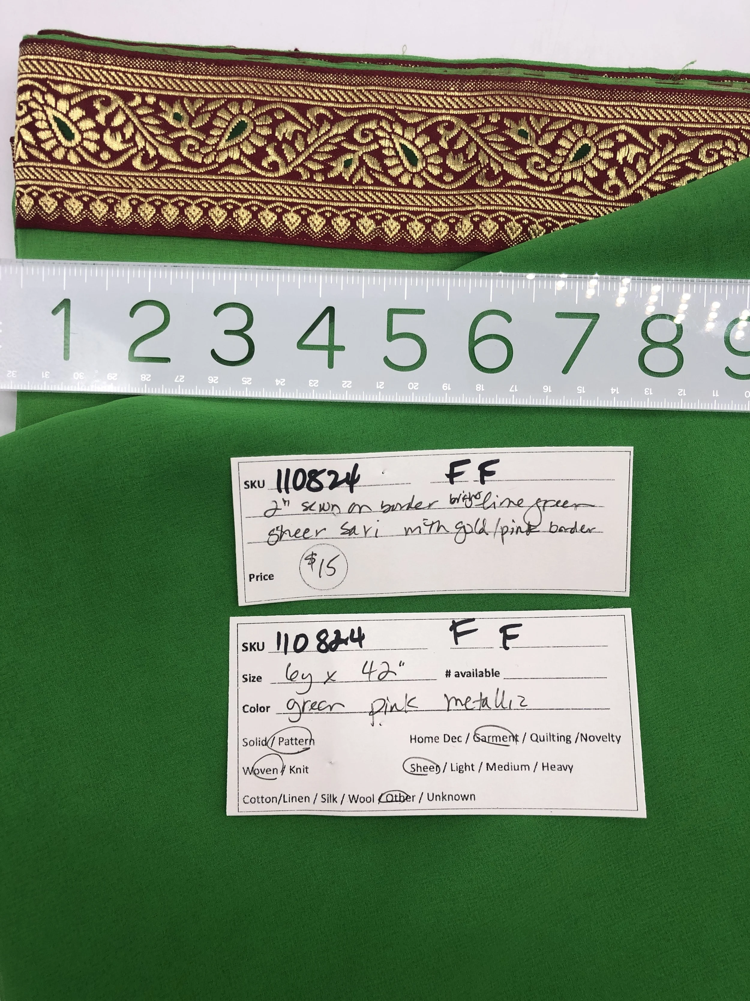 Bright lime green sheer sari with two inch sewn on gold and pink border.