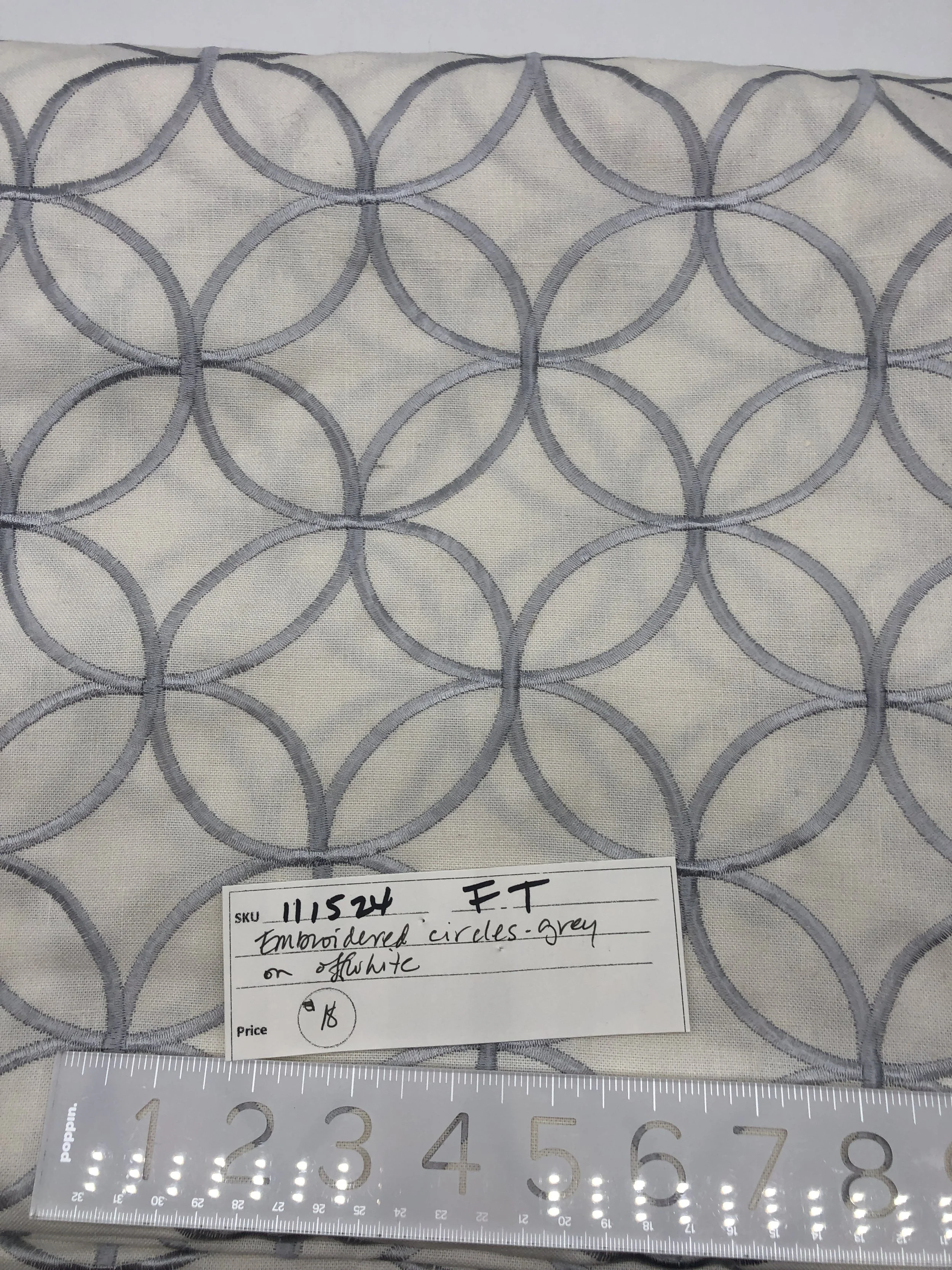 Online Store › 111524-F-T Embroidered overlapping grey circles on off-white; 3 yd x 54" Image 1 of 2 Image 2 of 2 111524-F-T Embroidered overlapping grey circles on off-white; 3 yd x 54" $18.00 Grey embroidered overlapping circles on off-white background. Lightweight home decor fabric. Measures 3 yd x 54" wide. Add To Cart Added! Grey embroidered overlapping circles on off-white background. Lightweight home decor fabric. Measures 3 yd x 54" wide.