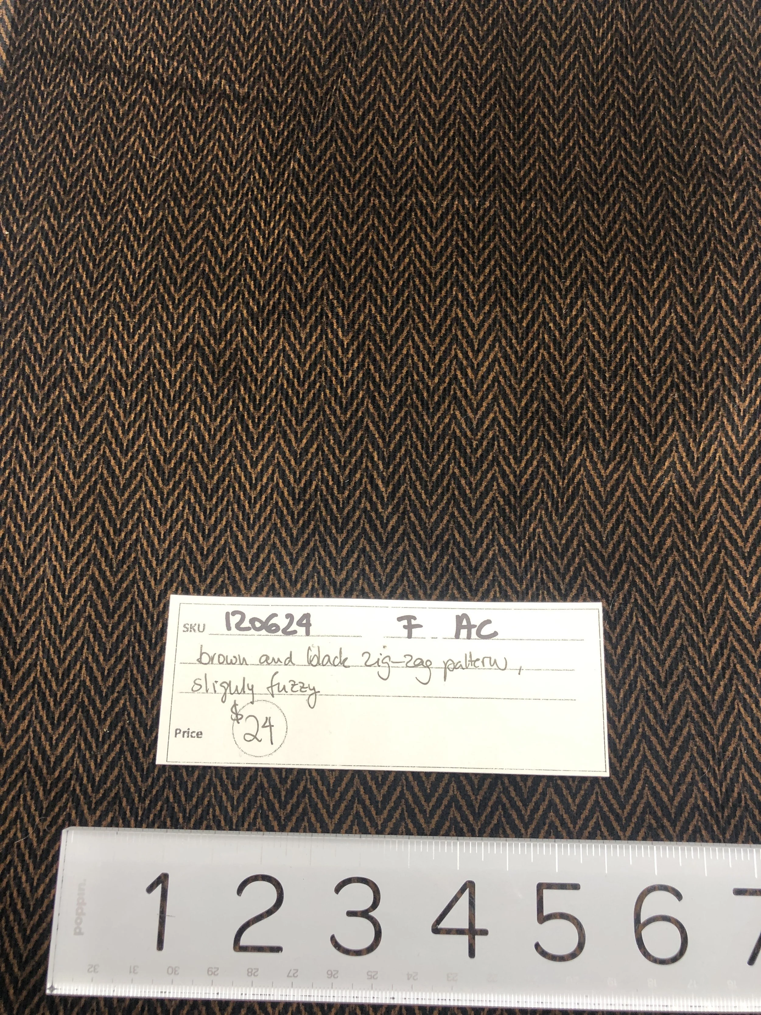 Online Store › 120624-F-AC Zig-zag brown/black cotton, 4 yd x 44" Image 1 of 2 Image 2 of 2 120624-F-AC Zig-zag brown/black cotton, 4 yd x 44" $24.00 Brown and black zig-zag pattern, slightly fuzzy cotton, 4 yards x 44” wide Quantity: Add To Cart Added! Brown and black zig-zag pattern, slightly fuzzy cotton, 4 yards x 44” wide